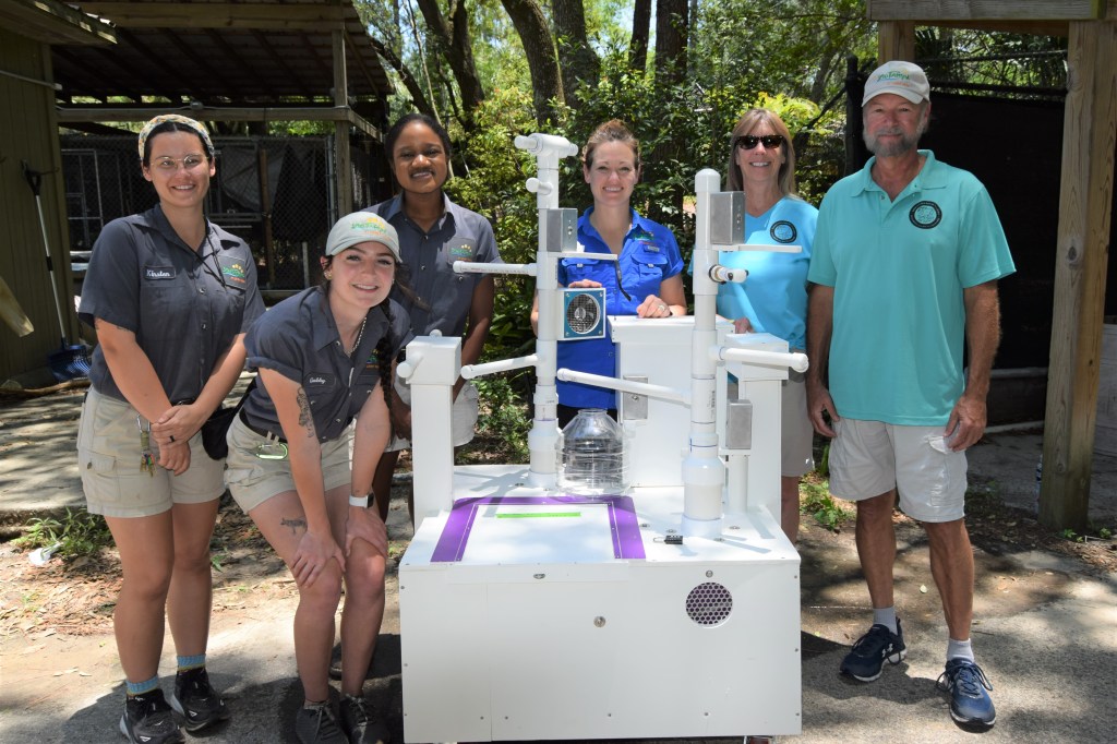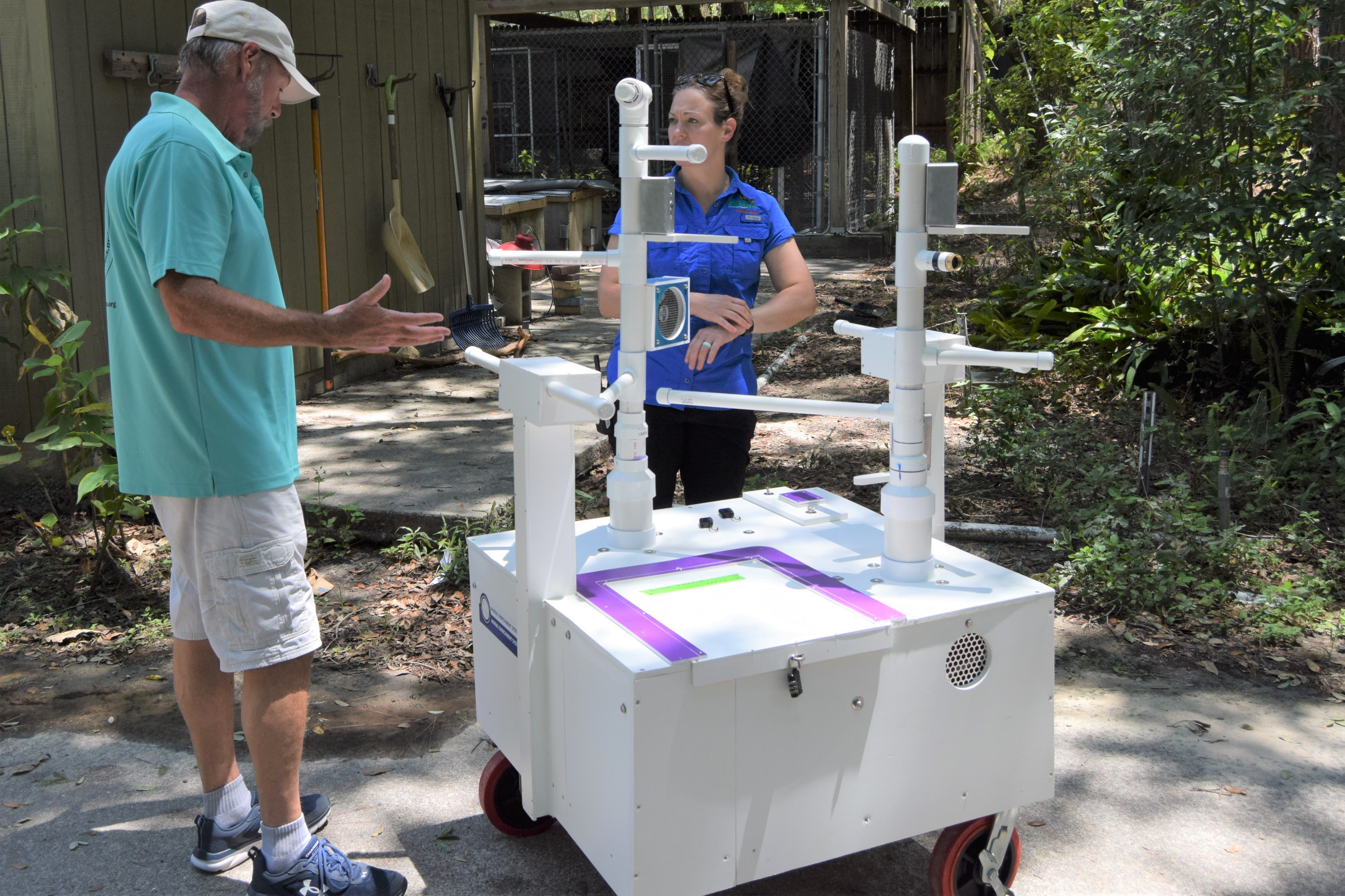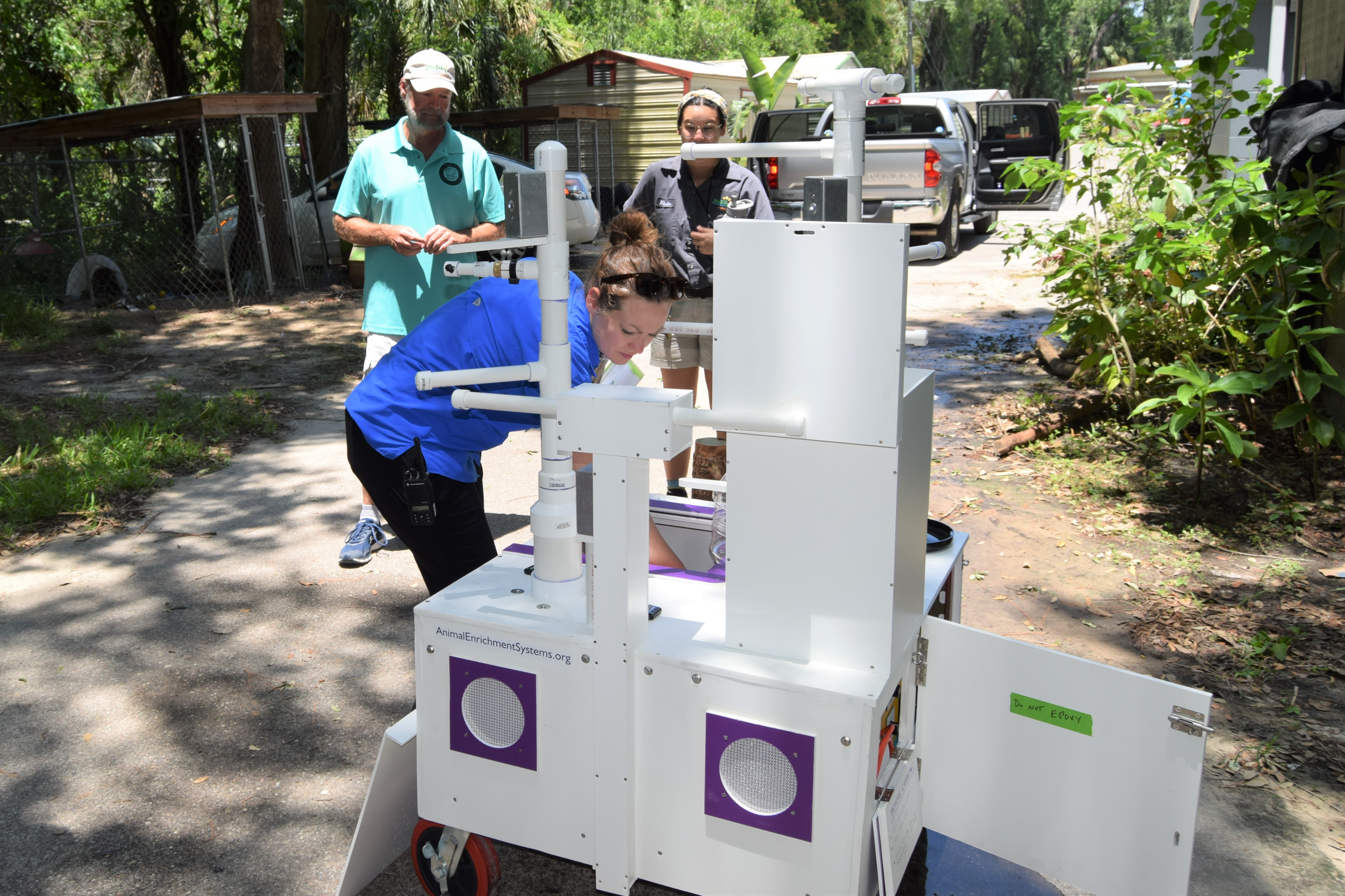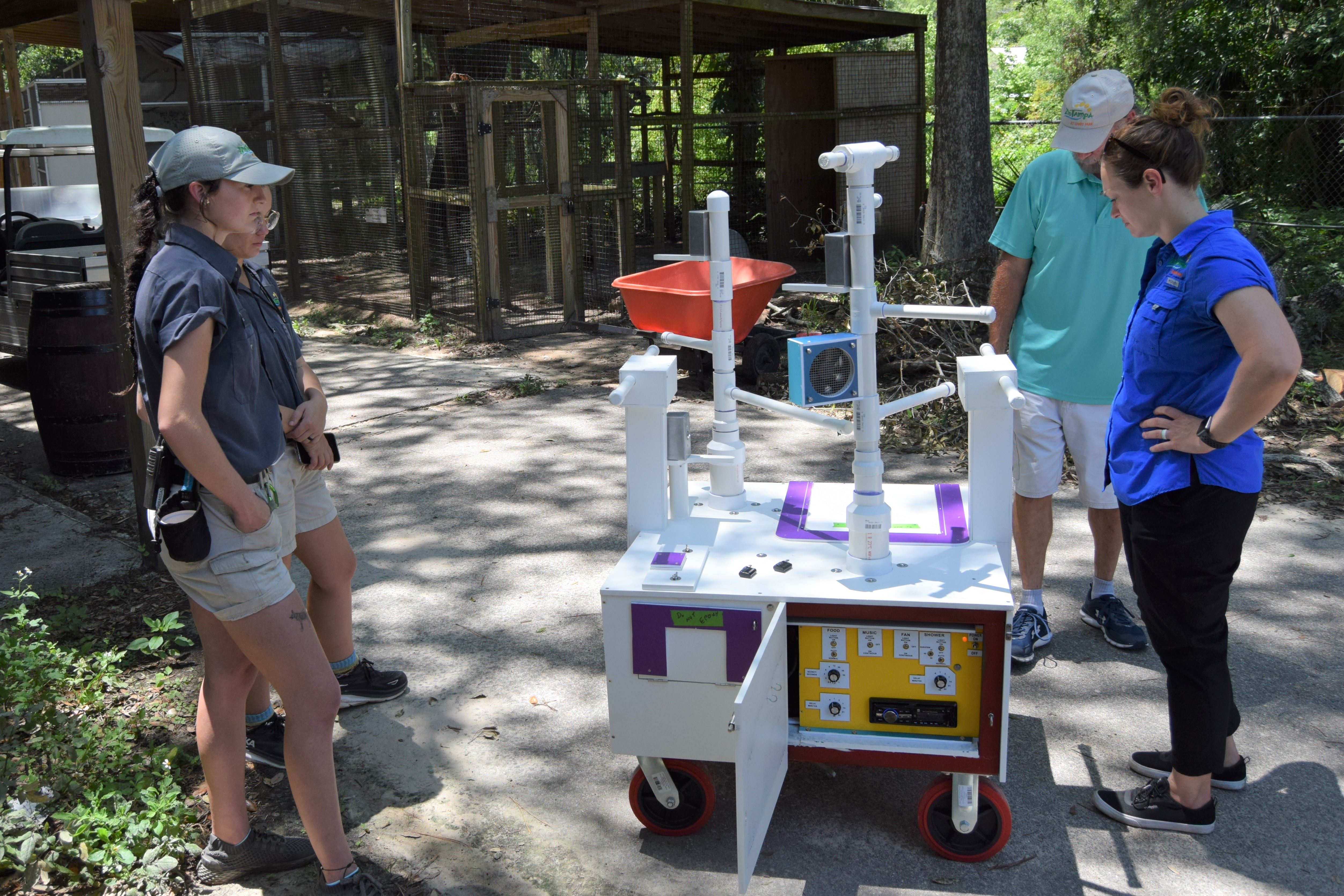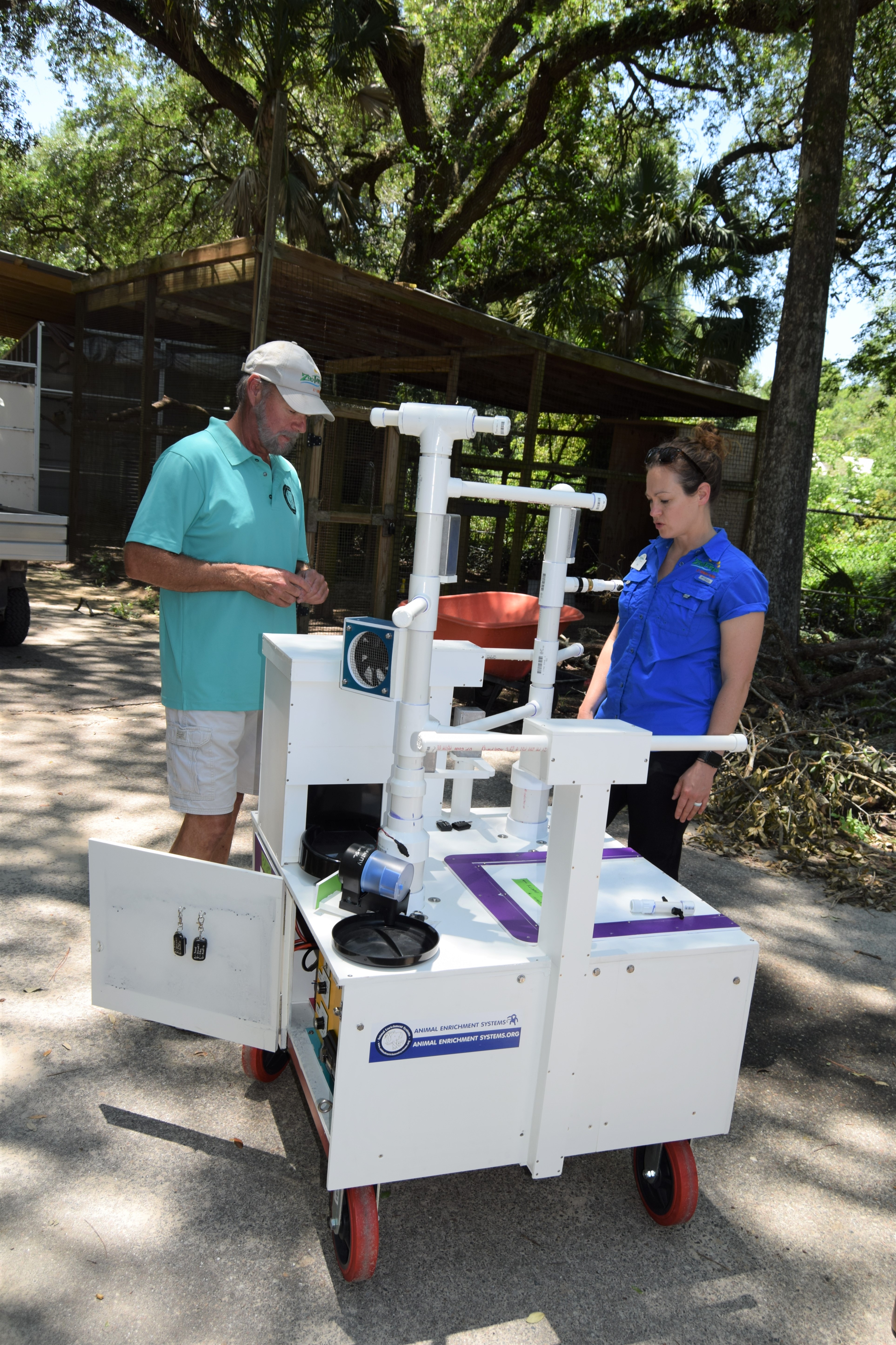 We had a very successful trip to ZooTampa on Monday. Everyone was eager to watch the demonstration and learn how to operate the features of the cart. The cart perches will be covered in an epoxy that will harden to look like tree bark. ZooTampa will use this cart with some of their ambassador birds and possibly their prehensile-tailed porcupine ambassador animal. The Critter Cart has four enrichment options: Water, Food dispenser, Bird Chirp sounds/music and a water spray. The animals can learn to push the buttons on the perches, or the zookeepers can push a remote to start the enrichment features.