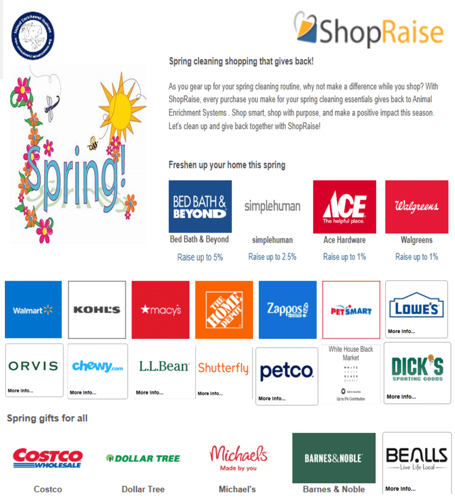 Do you want to help raise funds for our Non-Profit? Try using Shop Raise for your online shopping. It is free to you and each participating merchant donates a portion of the sales to Animal Enrichment Systems. (You click on the merchant and it takes you to their webpage) It is no cost to you.
