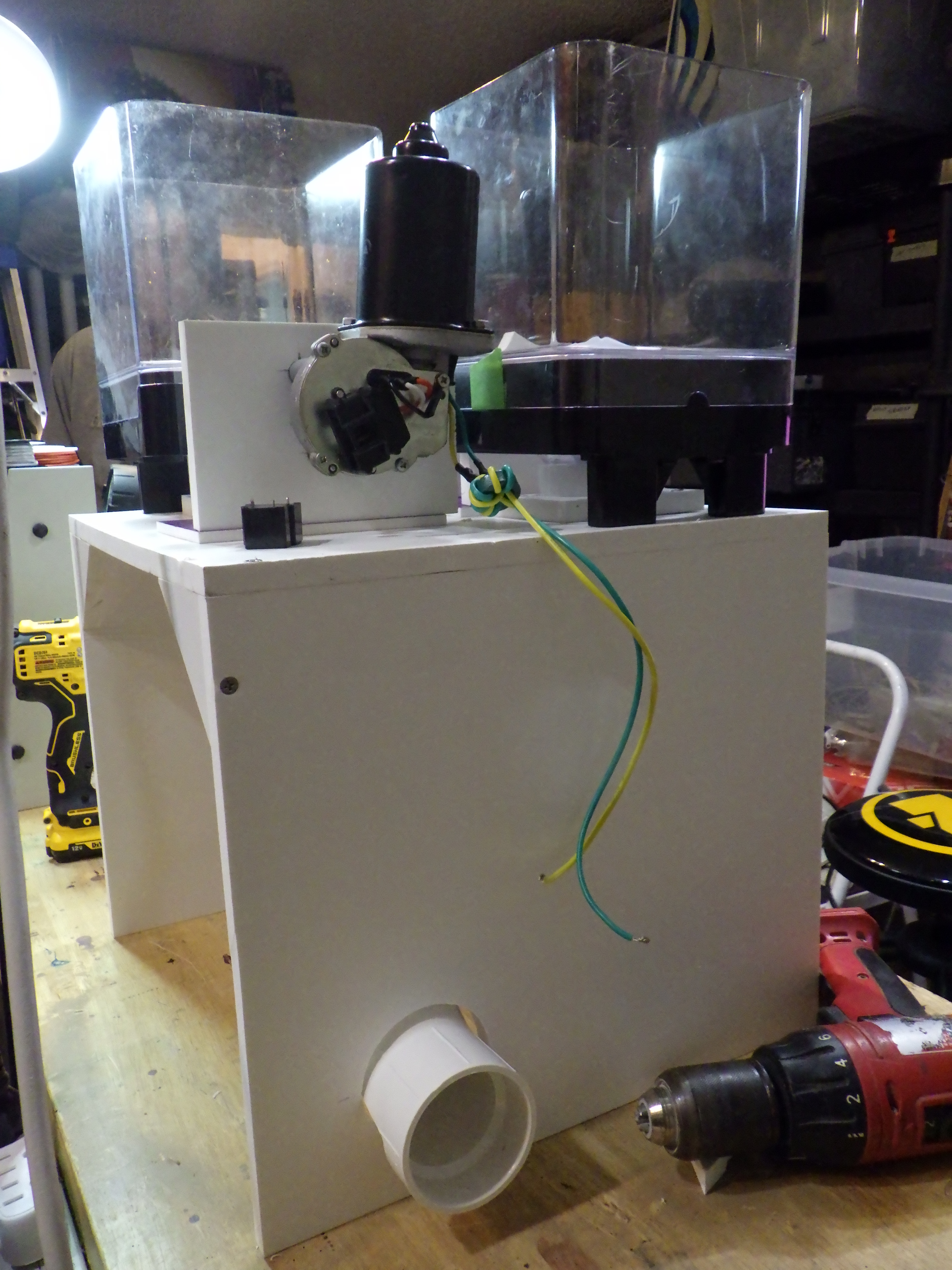 This is the dispenser section of the EED. It consists of two cereal dispenser driven by windshield wiper motors. It will be controlled by a battery powered control system activated by switched (push buttons) that the animals can control. There will be three switches, one for each dispenser, and the third will activate both dispensers simultaneously. This allows animals to share the fun or just get a treat for themselves. Lights will indicate when the buttons are active. The zoo keepers can use programmable timers to set the inactive durations and amount of treats to be dispensed.