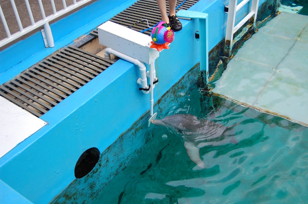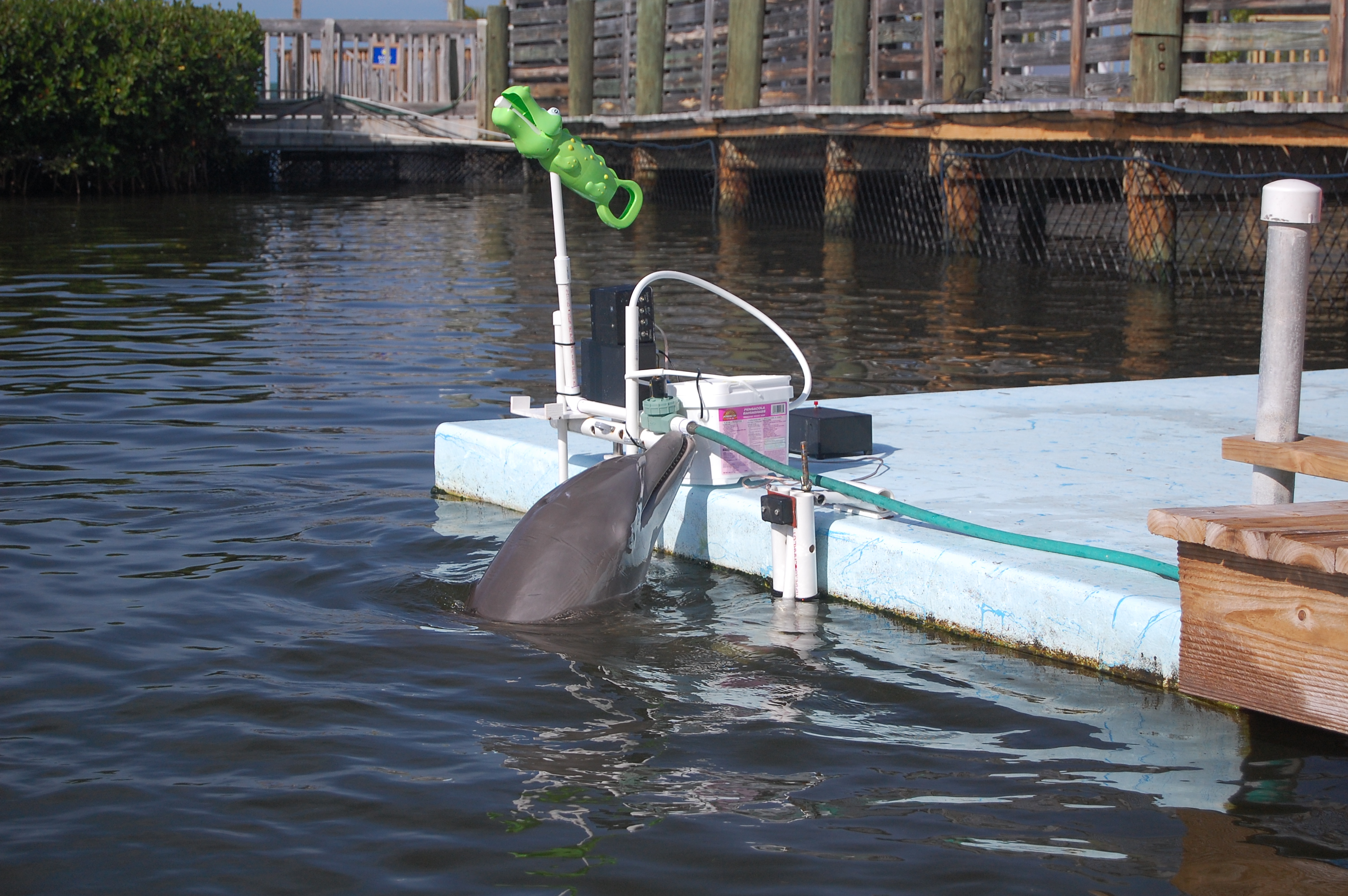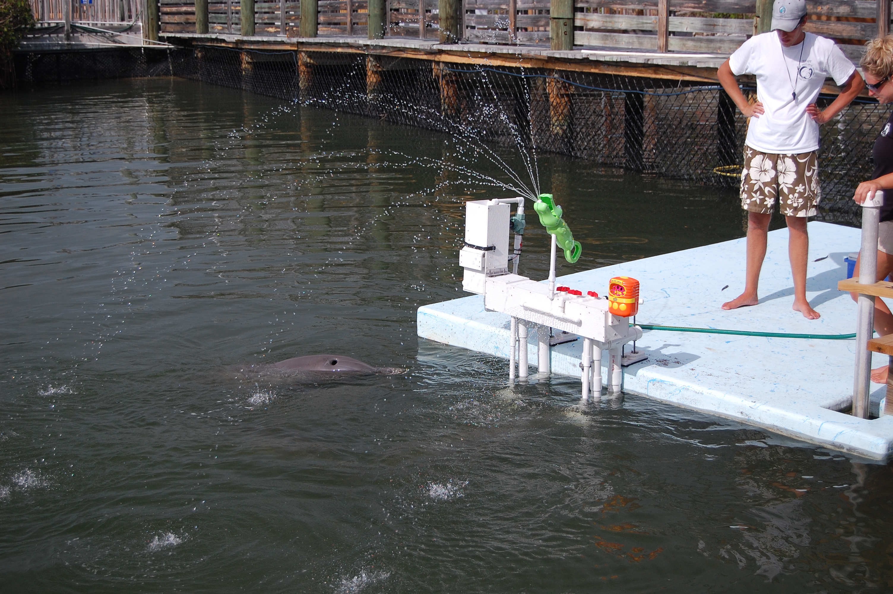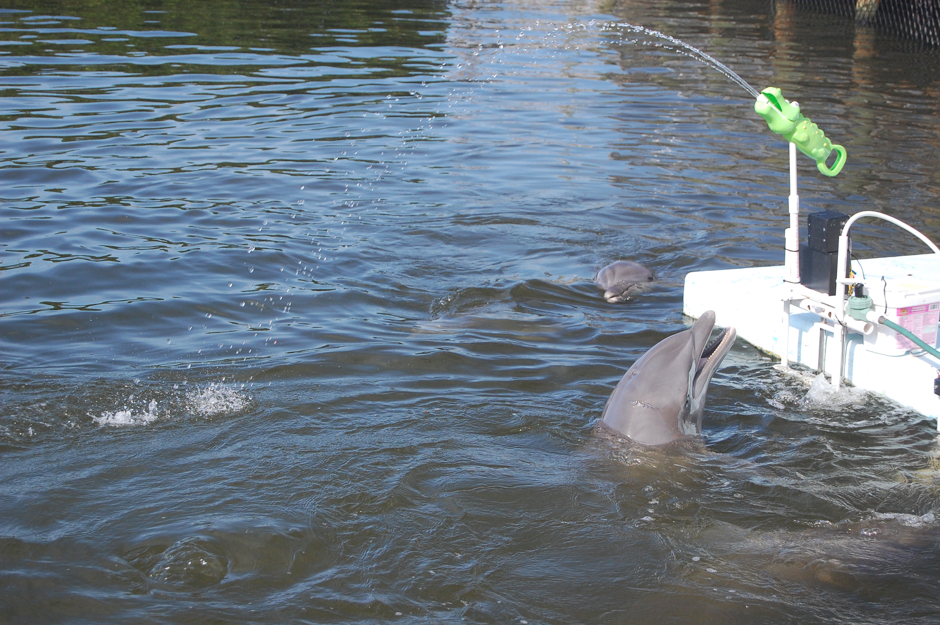 Don’s first attempt was a water fountain mounted to a floating dock that the dolphins would activate by a paddle. The fountain was powered by a 12-volt underwater pump. Being so intelligent and curious, the dolphins took less than 5 minutes to start pressing the paddle. Unfortunately, the dolphins did not play very long, as they did not like the sound of the pump running under water.