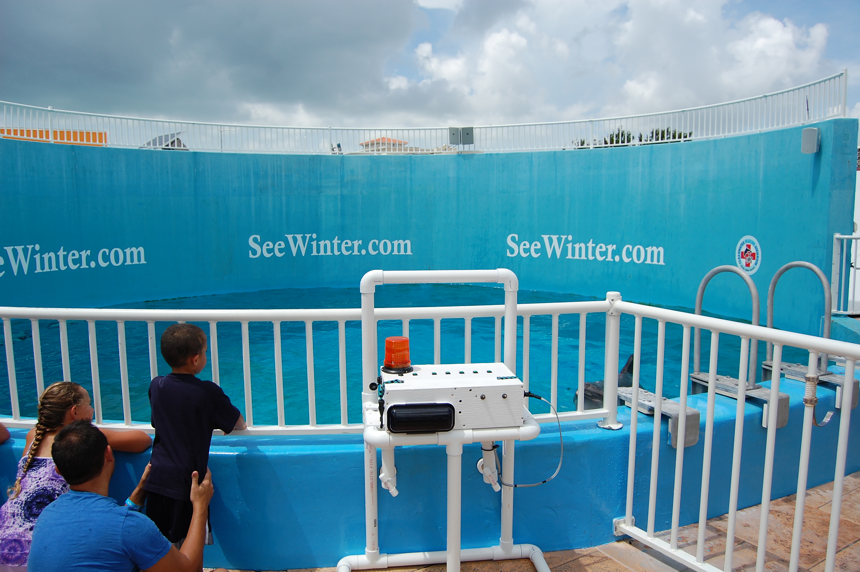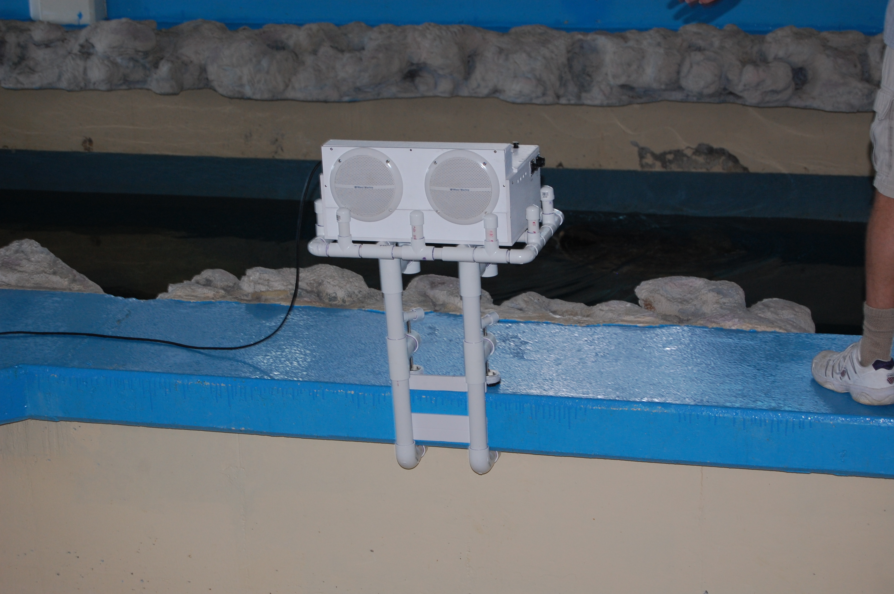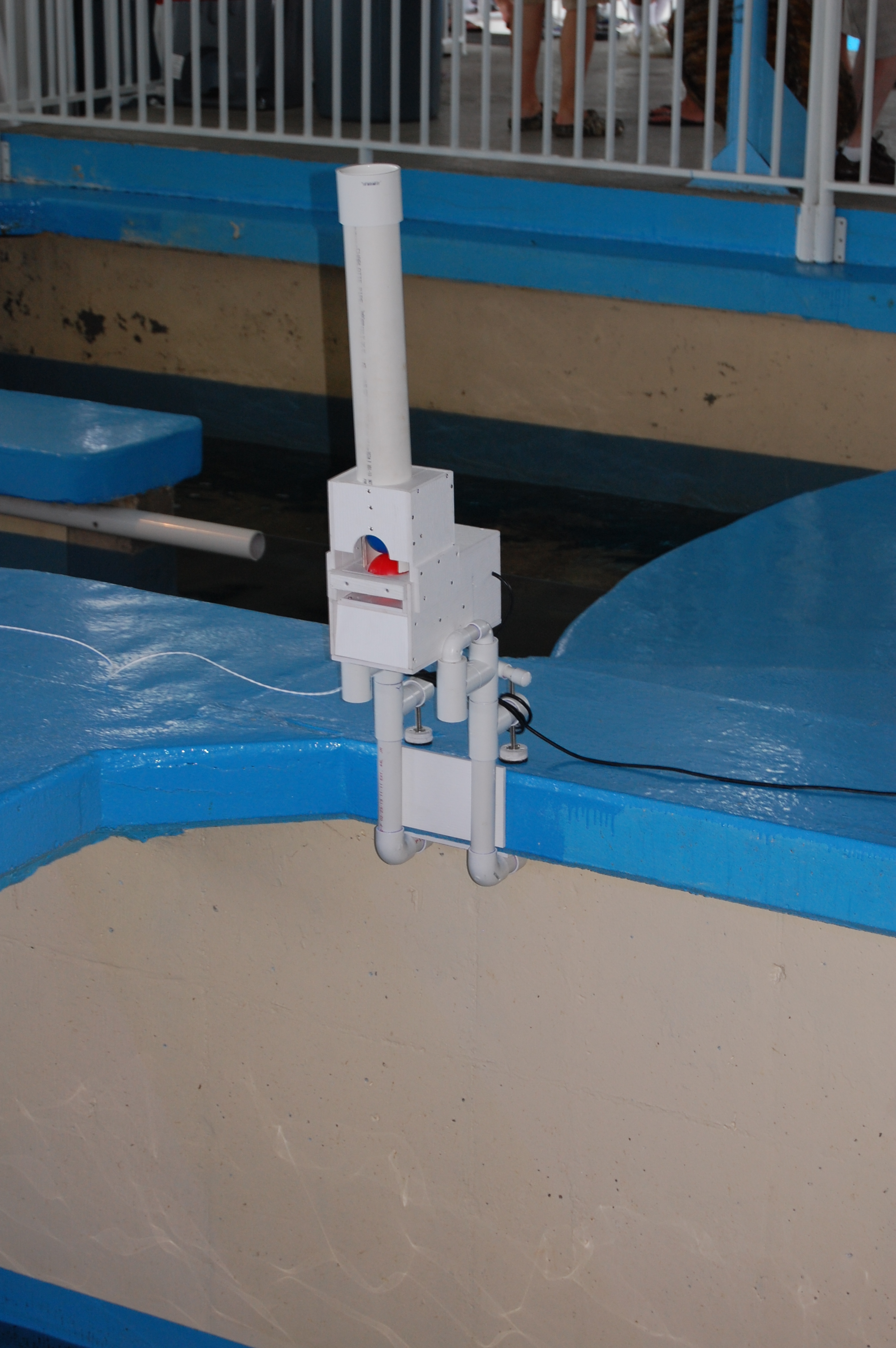 After talking to the trainer, it was agreed that Don would develop an EED for both Hope and Winter. Since Hope was so interested in chasing bubbles, the EED created generated both soap bubbles above the surface and air bubbles 15 feet below the surface. The paddle to activate the EED was attached to a unit that mounted to the side of the pool. When the paddle was pressed, bubbles would be generated for 30 seconds. The dolphin would need to press the paddle again to start another 30 second session. The EED’s challenge for the dolphins was that the underwater bubbles were located up to 30 feet away from the paddle. The dolphins had to realize that something on one side of the pool made something happen on the other side. It only took young Hope about 15 minutes to figure this out. Hope then taught Winter how to use it by example.
