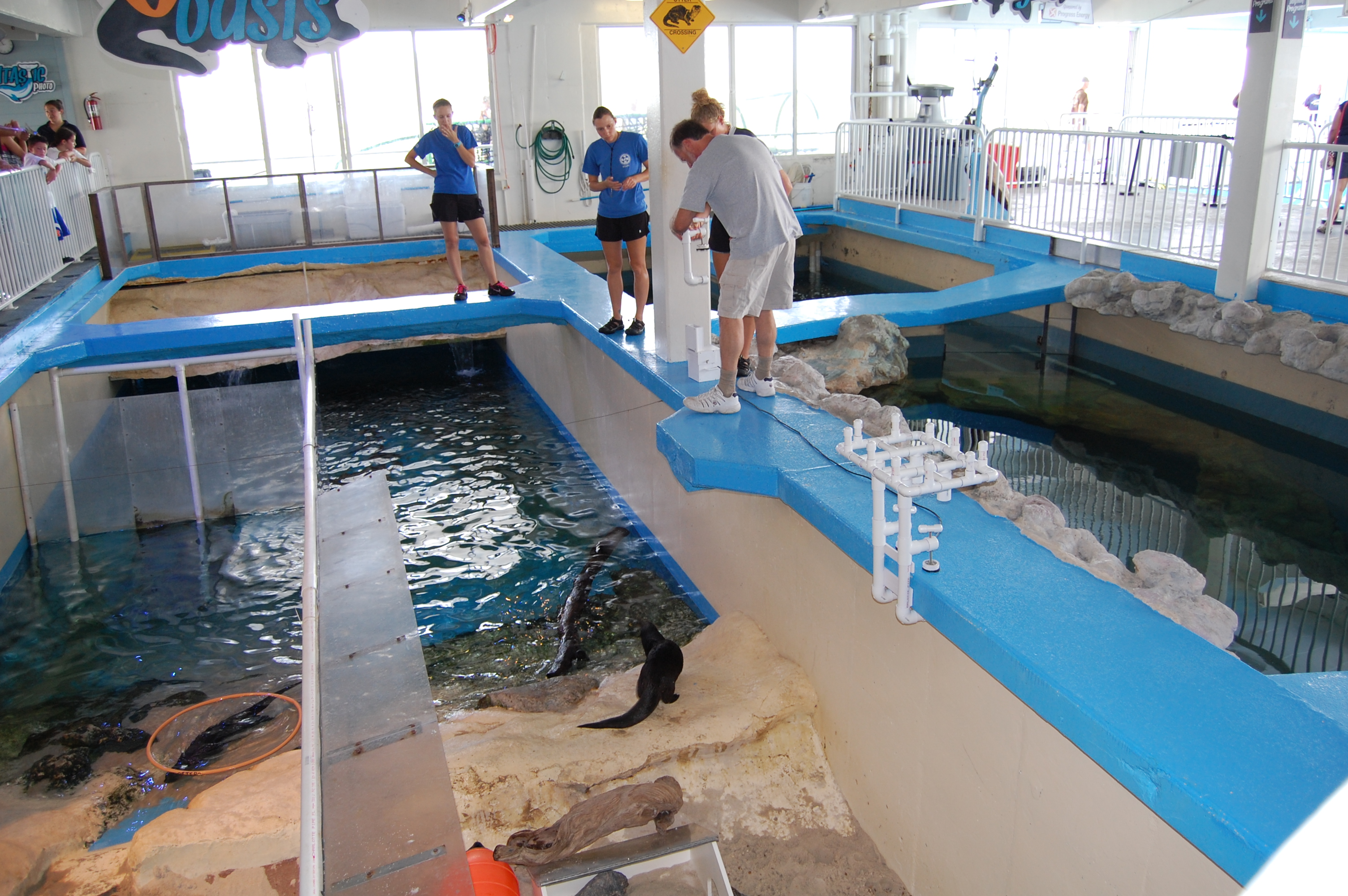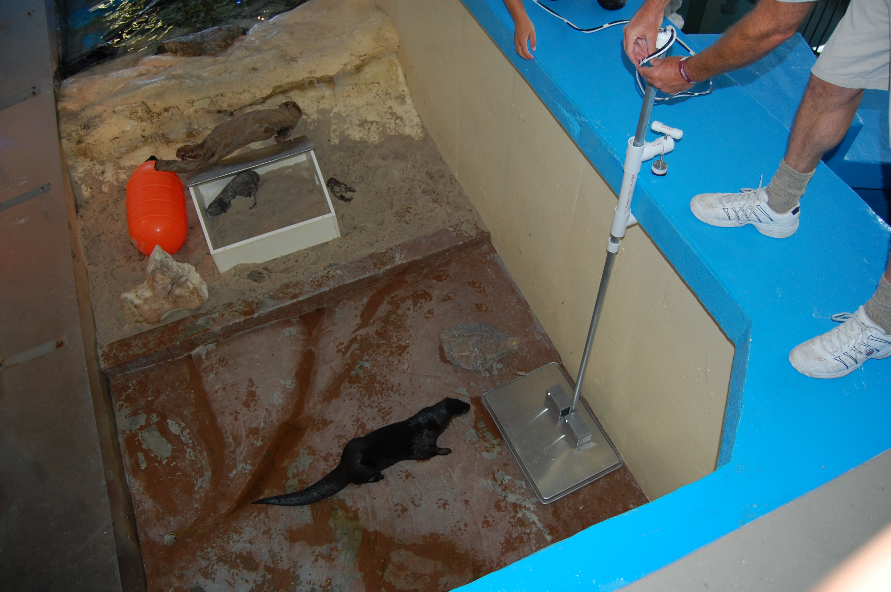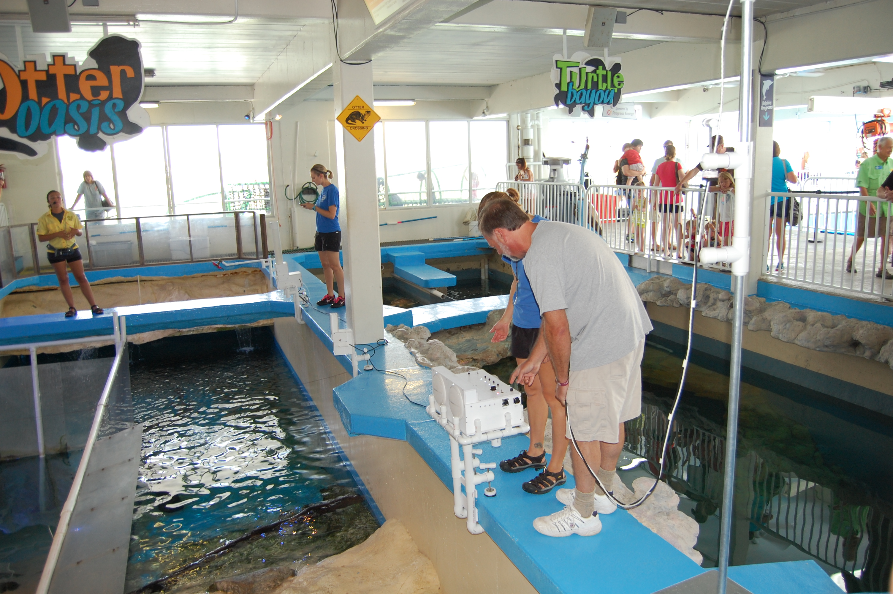 Expanding our reach. As the success of the Dolphin’s EEDs became clear, the Langs began to broaden their horizons and work with other animals, starting with North American River Otters. The EED created for the otters had a box with buttons that the otters could press with their noses. This EED’s features included dispensing floating balls, fish, and a water spray. The EED would also play an enticing “ta da da CHARGE” sound that meant the items would be dispensed.