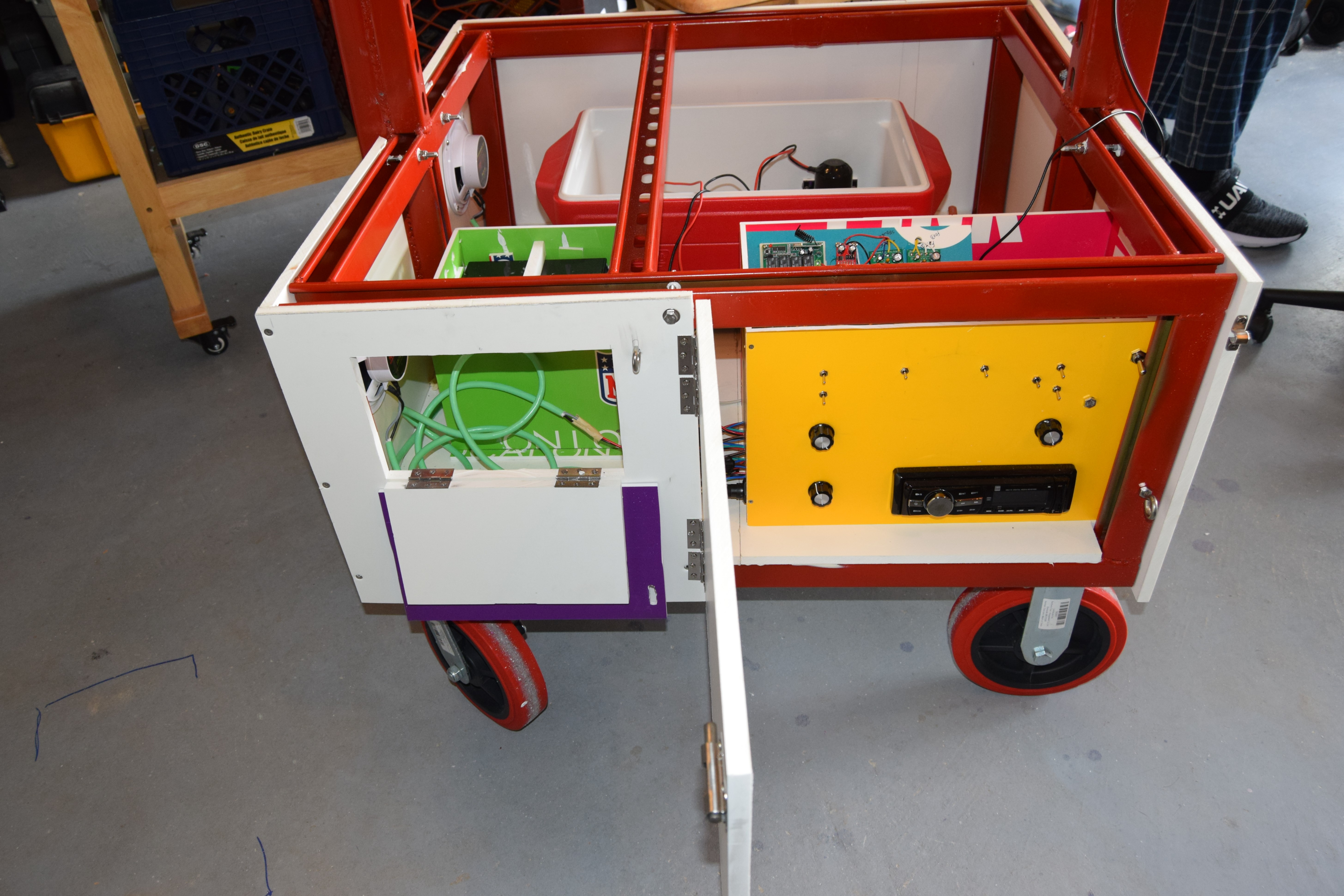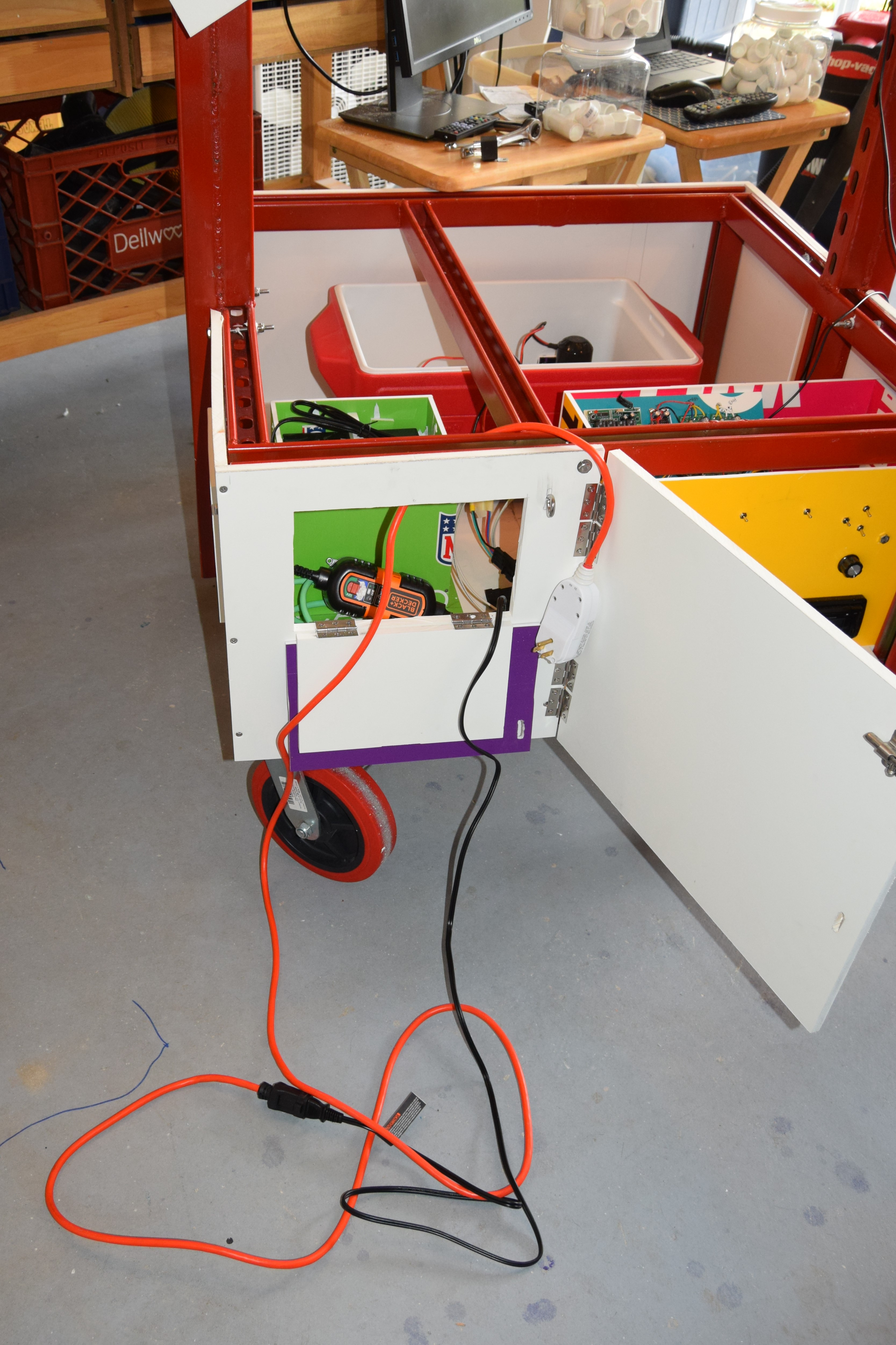 4-19-23: Update: Upon completion of the dual feeder the cart was ready for testing. When the pump for the shower was activated, it caused the feeder to dispense. The root cause of this issue was electromagnetic magnetic interference from the brushes in the pump. In order to correct this issue, the power system was split into two systems one for the controller electronics and the other for the enrichment devices. After splitting the power system, the erroneous triggering was much improved, however, every once in a while, the feeder would trigger (about once every ten minutes). Capacitive noise suppression was added to the pump circuit and that fixed the issue.