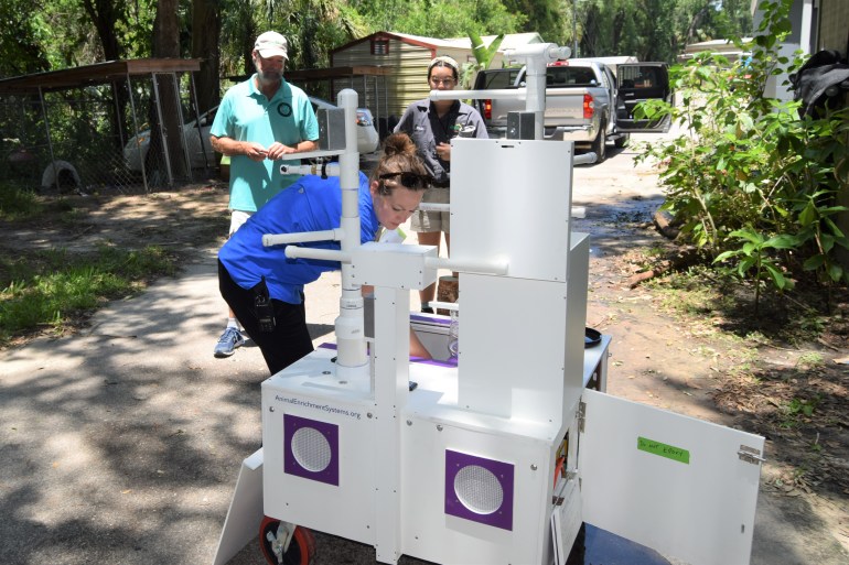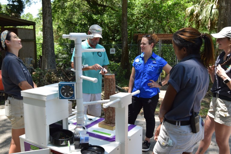 We tested the ZooTampa Critter Cart today. This has four features: fan, music/bird sounds, food/seed dispenser and water shower/spray