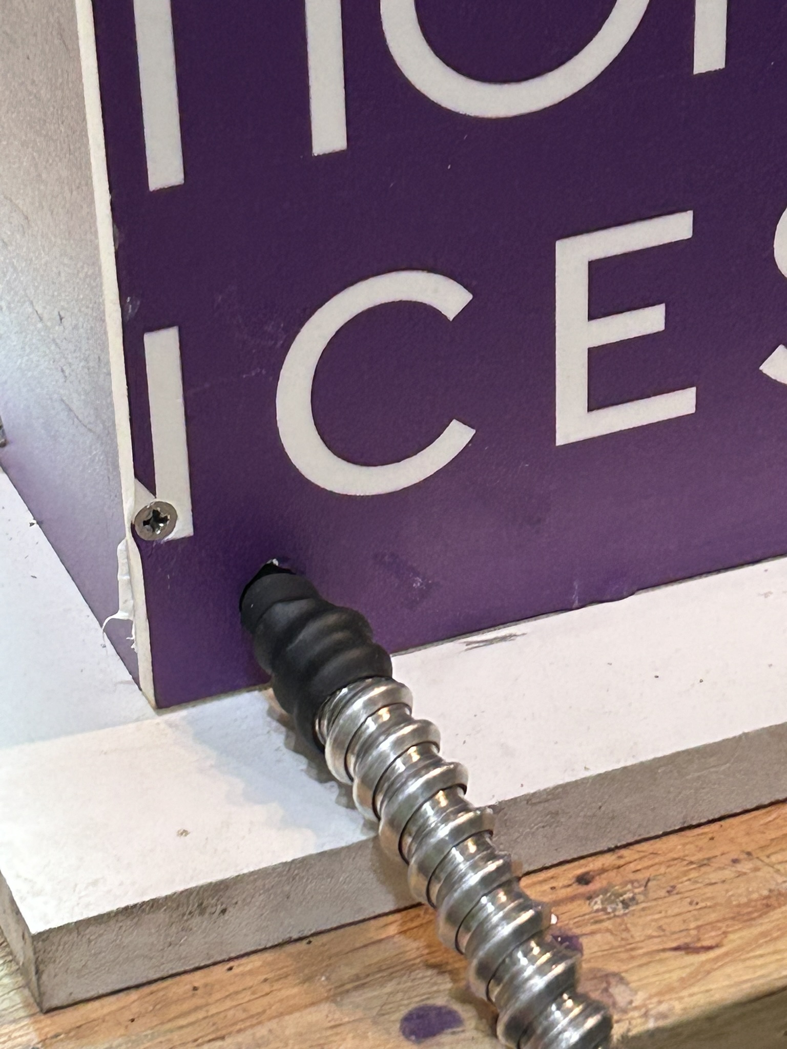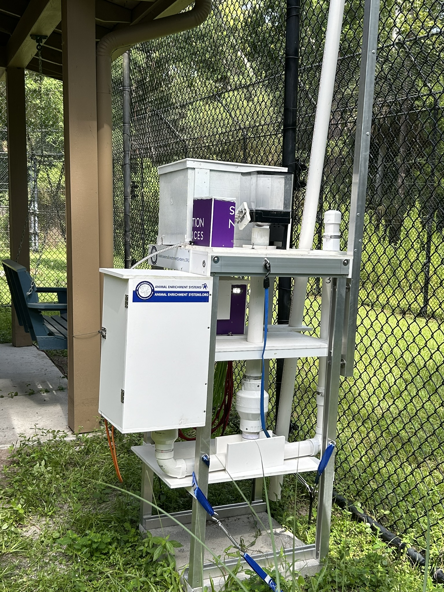 This is the dispenser section of the EED. It consists of two cereal dispenser driven by windshield wiper motors. It will be controlled by a battery powered control system activated by switched (push buttons) that the animals can control. There will be three switches, one for each dispenser, and the third will activate both dispensers simultaneously. This allows animals to share the fun or just get a treat for themselves. Lights will indicate when the buttons are active. The zoo keepers can use programmable timers to set the inactive durations and amount of treats to be dispensed.