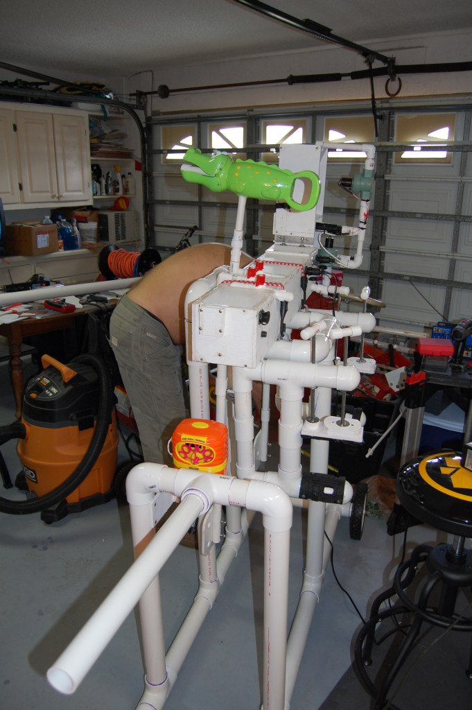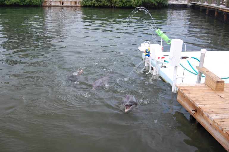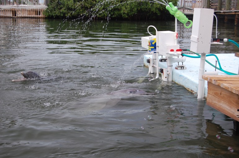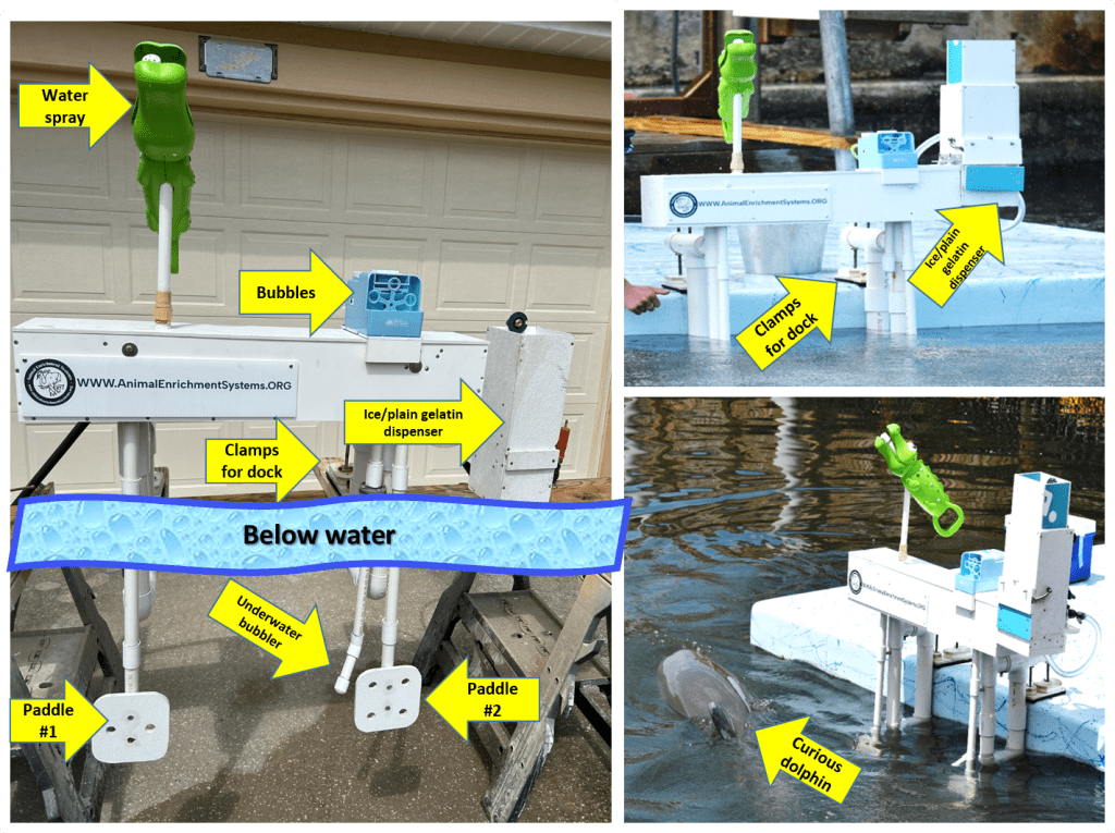 Our early designs consisted of an underwater bubbler/air blower with a small round paddle. Our next addition was the water sprinkler shooting out of the plastic alligator’s mouth. The dolphins would need to press the underwater paddle with their rostrum to turn on the first device, the air blower. We had to design something they could press, they don’t have fingers or hands. They had 30 seconds to go press the other underwater paddle to activate the water sprayer. Eventually we attached a soap bubble machine and/or an unflavored gelatin or ice dispenser. The underwater paddles were designed to have different patterns of holes on them so the dolphins could use their echolocation to choose to what they wanted to turn on.
