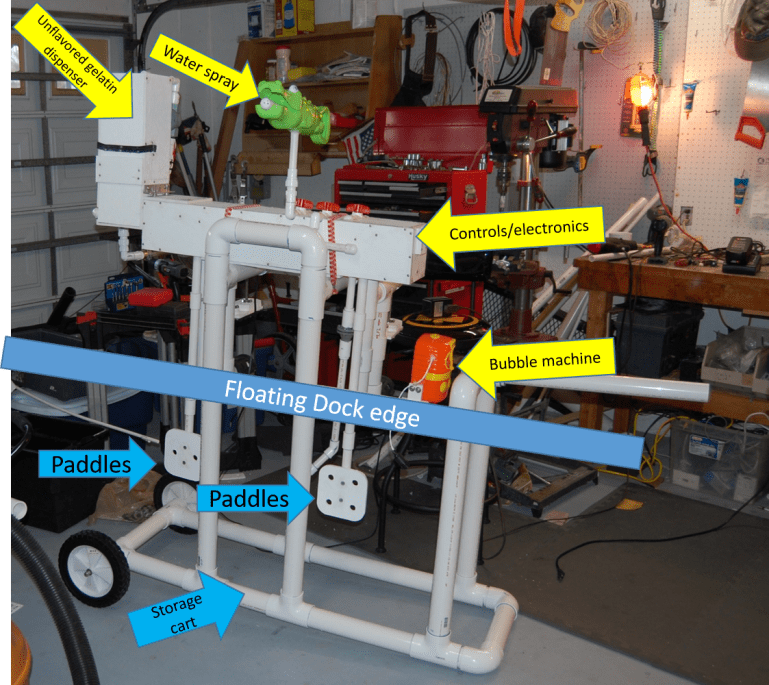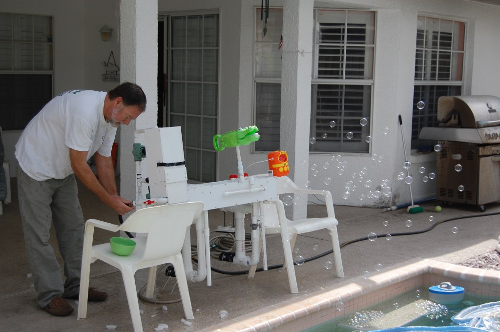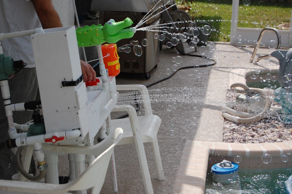 After talking to the trainer, it was agreed that Don would develop an EED for both Hope and Winter. Since Hope was so interested in chasing bubbles, the EED created generated both soap bubbles above the surface and air bubbles 15 feet below the surface. The paddle to activate the EED was attached to a unit that mounted to the side of the pool. When the paddle was pressed, bubbles would be generated for 30 seconds. The dolphin would need to press the paddle again to start another 30 second session. The EED’s challenge for the dolphins was that the underwater bubbles were located up to 30 feet away from the paddle. The dolphins had to realize that something on one side of the pool made something happen on the other side. It only took young Hope about 15 minutes to figure this out. Hope then taught Winter how to use it by example.