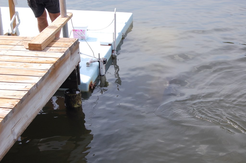After experimenting with a couple different designs, Don found that using a garden hose and various valves was pleasing to the dolphins. Using this new information, Don launched a re-build of a device that became known as DESy (Dolphin Enrichment System). This unit was attached to the floating docks and had underwater paddles that, when pressed in the correct sequence, provided ice cubes, plain gelatin, underwater air bubbles, and a water fountain. The dolphins loved it! The DRC team presented DESy at the Miami IMATA (International Marine Animal Trainer’s Association) Conference. DESy won that year for best marine mammal enrichment.