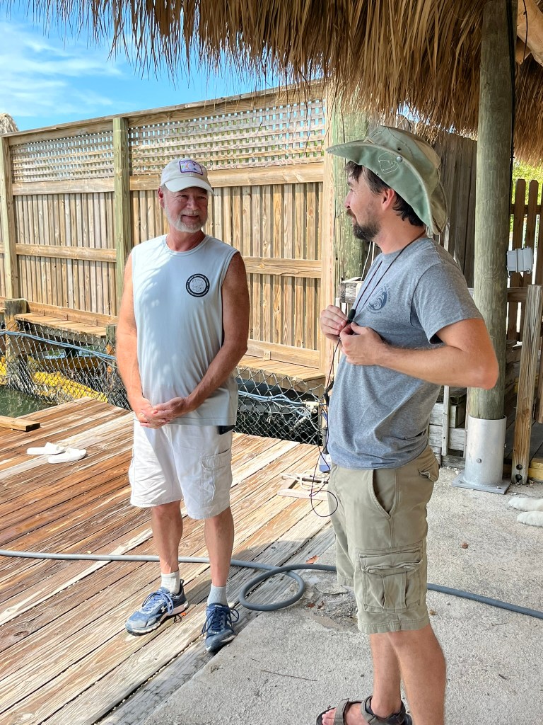 While watching Saturday morning animal show on TV, a program aired featuring a baby dolphin calf named Hope. The aquarium, Clearwater Marine Aquarium (CMA), was able to save and hand-raise the very young orphaned dolphin calf. Because of the Langs’ experience with dolphins, it was obvious that this was an amazing feat and prompted a trip to meet this miracle baby dolphin. At Clearwater Marine Aquarium (Home of Winter, another rescued dolphin), Hope was found living in a large round pool with an underwater platform. She had plenty of floating toys but preferred to blow bubbles under the platform and chase them to the surface. Watching this behavior prompted a conversation with an intern about the intelligence and creativity of dolphins. Naturally, the conversation got around to a description of the EEDs created for DRC. The intern said, “Don’t you move! I’m going to get one of the trainers to come out and talk to you.”