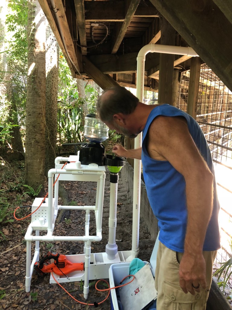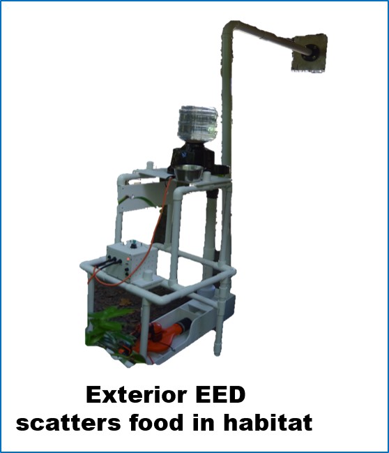The indoor device has a food dispenser that, when activated, deposits a measured amount of food into a feeder that simulates a termite-filled log. The bear uses its natural termite sucking behavior to get the food out. The outdoor device uses the same dispenser, but uses air power to scatter food pellets and seeds throughout their habitat promoting foraging behavior