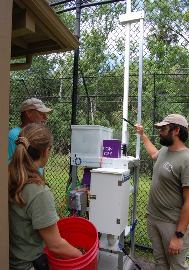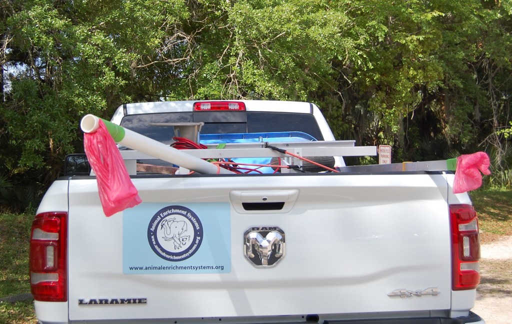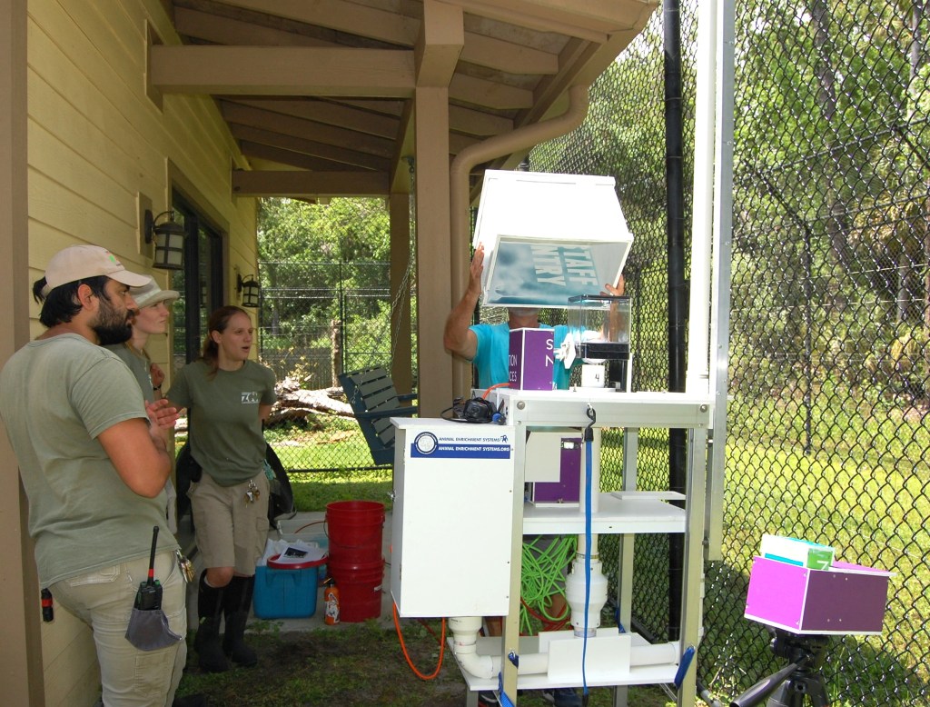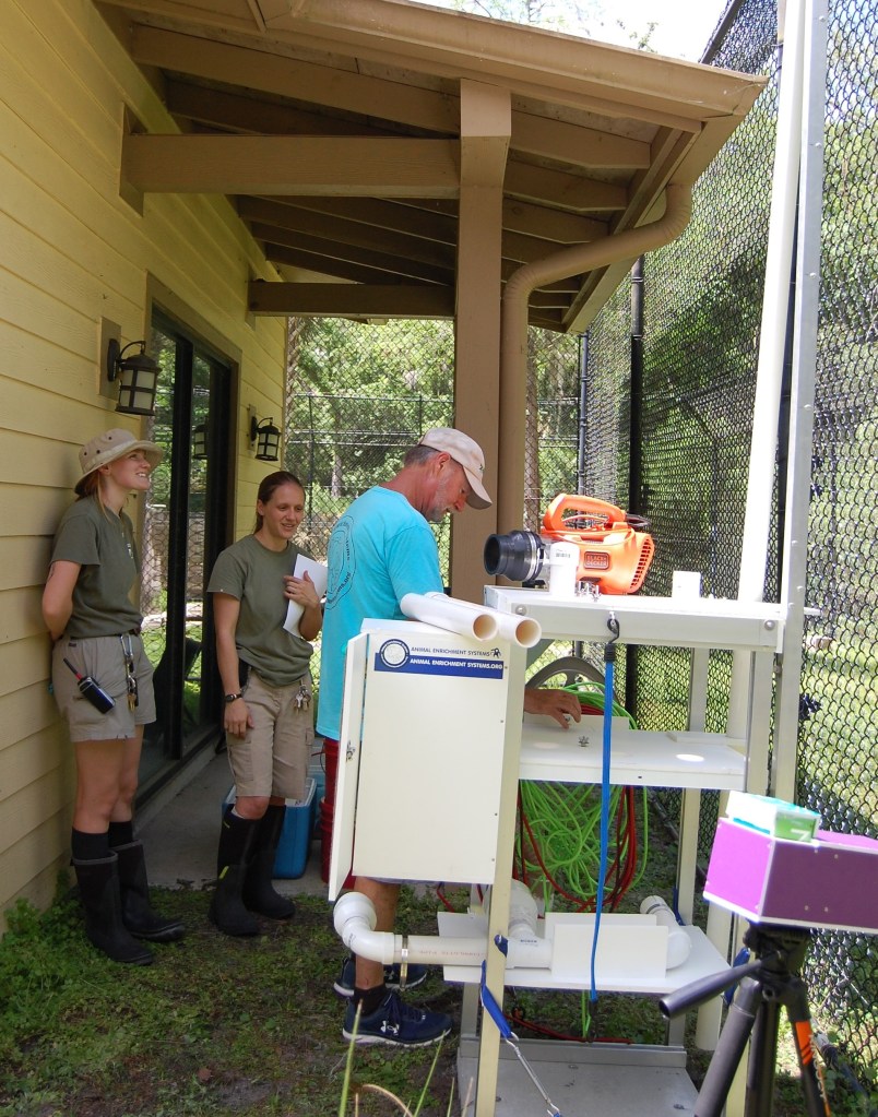 We delivered the Black Bear environmental enrichment device (EED) to Central Florida Zoo on Tuesday, April 2. The weather was gorgeous, the zoo staff were awesome and the bears, Guignard and Ella, were curious. We met with four keepers to go over assembly and instructions