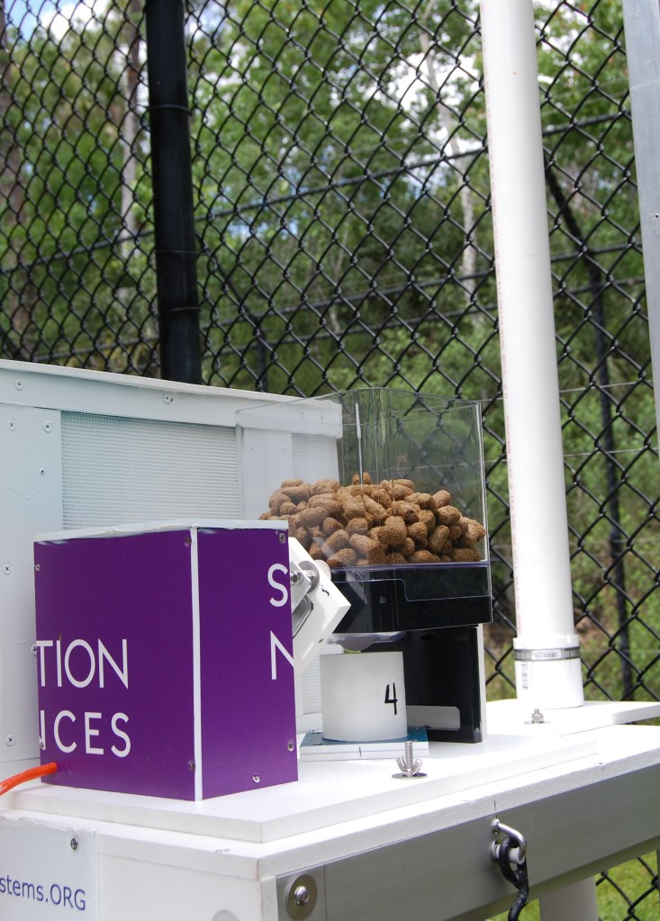 Treats were added to the system and the bears were released into their habitat. The bears walked near the motion sensor and the treats were blown up and into their habitat.